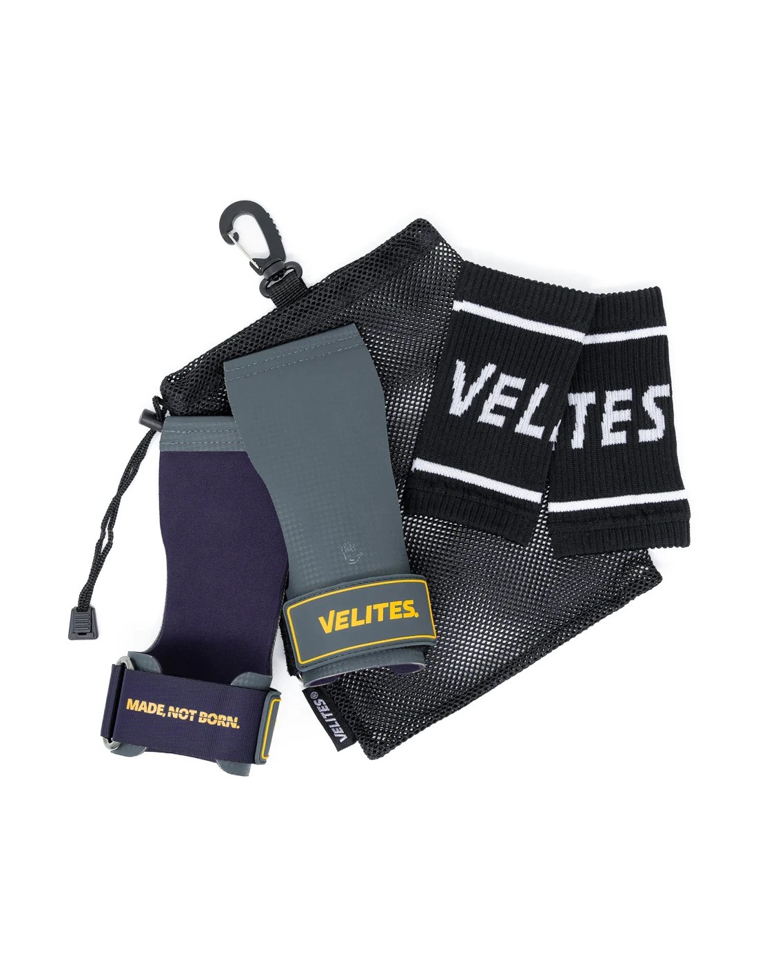 Este producto incluye: Calleras Quad Ultra, Muñequeras de tela flexible y Bolsa de transporte antiolores.