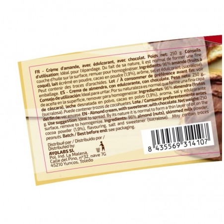 Ingredientes: 96% almendra (frutos de cáscara), leche desnatada en polvo, aroma, sal y edulcorante (sucralosa). Puede contener trazas de almendras, avellanas, nueces de nogal, anacardos, nueces de macadamia y soja.Conservar bien cerrado en un lugar fresco y seco.