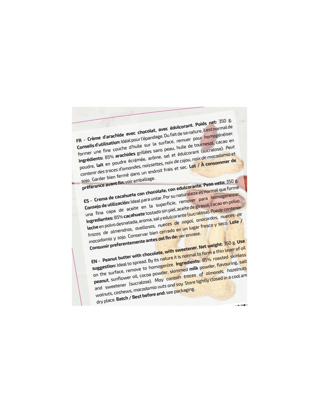 Ingredientes: 85% cacahuete tostado sin piel, aceite de girasol, cacao en polvo, leche en polvo desnatada, aroma, sal y edulcorante (sucralosa). Puede contener trazas de almendras, avellanas, nueces de nogal, anacardos, nueces de macadamia y soja.Conservar bien cerrado en un lugar fresco y seco.