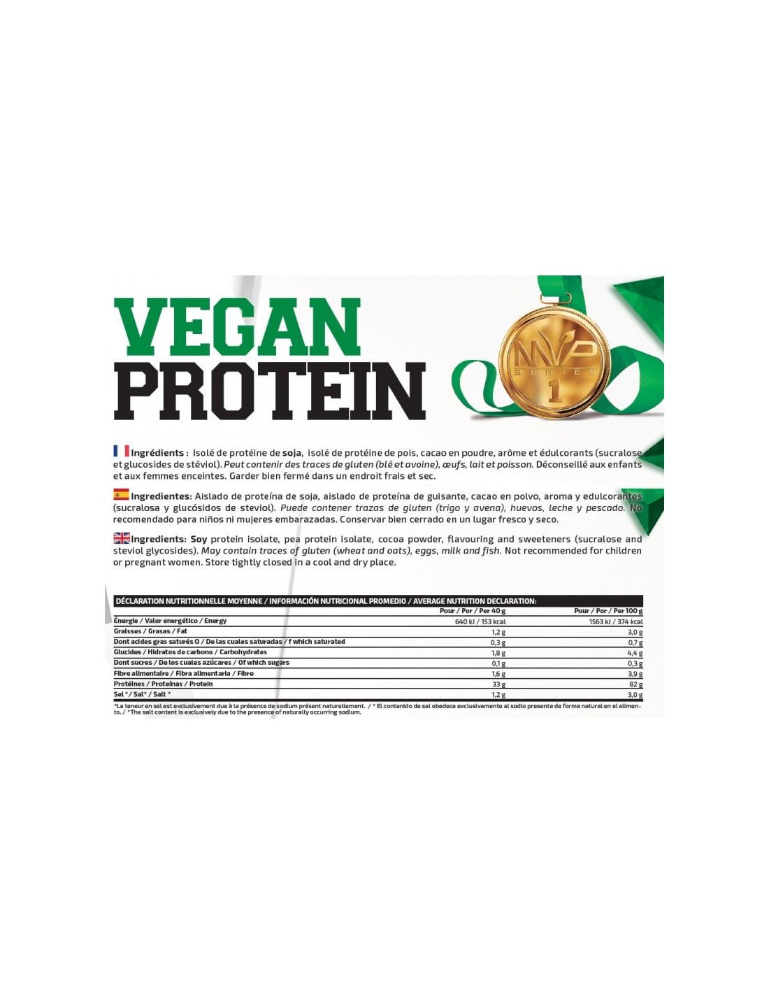 Preparado en polvo a base de aislado de proteína de vegetal, con edulcorante, enriquecido con vitamina B6. Sabor chocolate. Peso neto: 1 kg. Consejo de utilización: Mezclar 40 g del producto (2 cazos dosificadores) con líquido (agua, leche desnatada, etc.). Ingredientes: Aislado de proteína de soja, aislado de proteína de guisante, cacao en polvo, aroma, edulcorantes (sucralosa y glucósidos de steviol) y vitamina B6 (clorhidrato de pididoxina). Puede contener trazas de gluten (trigo y avena), huevos, leche y pescado.