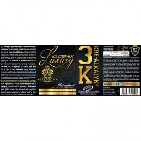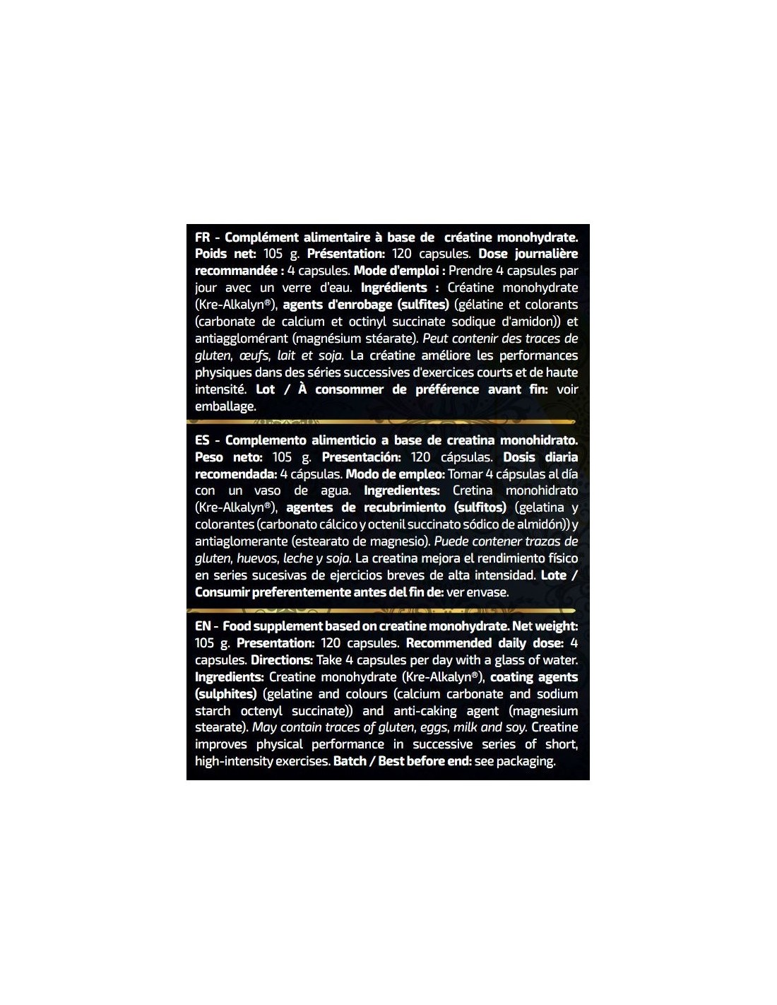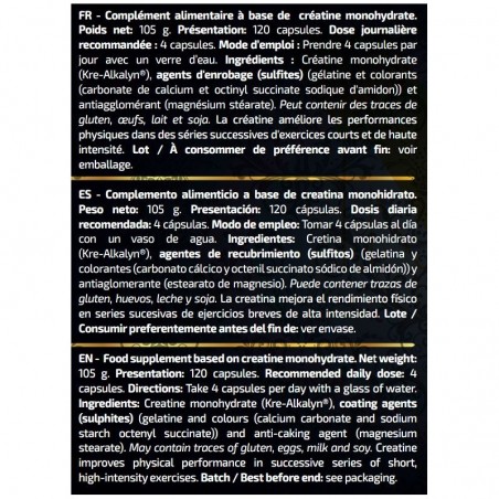 Ingredientes: Cretina monohidrato (Kre-Alkalyn®), agentes de recubrimiento (sulfitos) (gelatina y colorantes (carbonato cálcico y octenil succinato sódico de almidón)) y antiaglomerante (estearato de magnesio). Puede contener trazas de gluten, huevos, leche y soja.