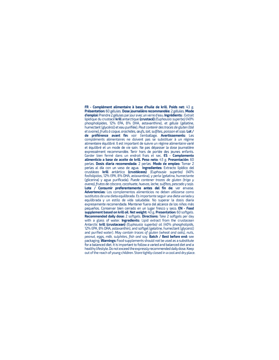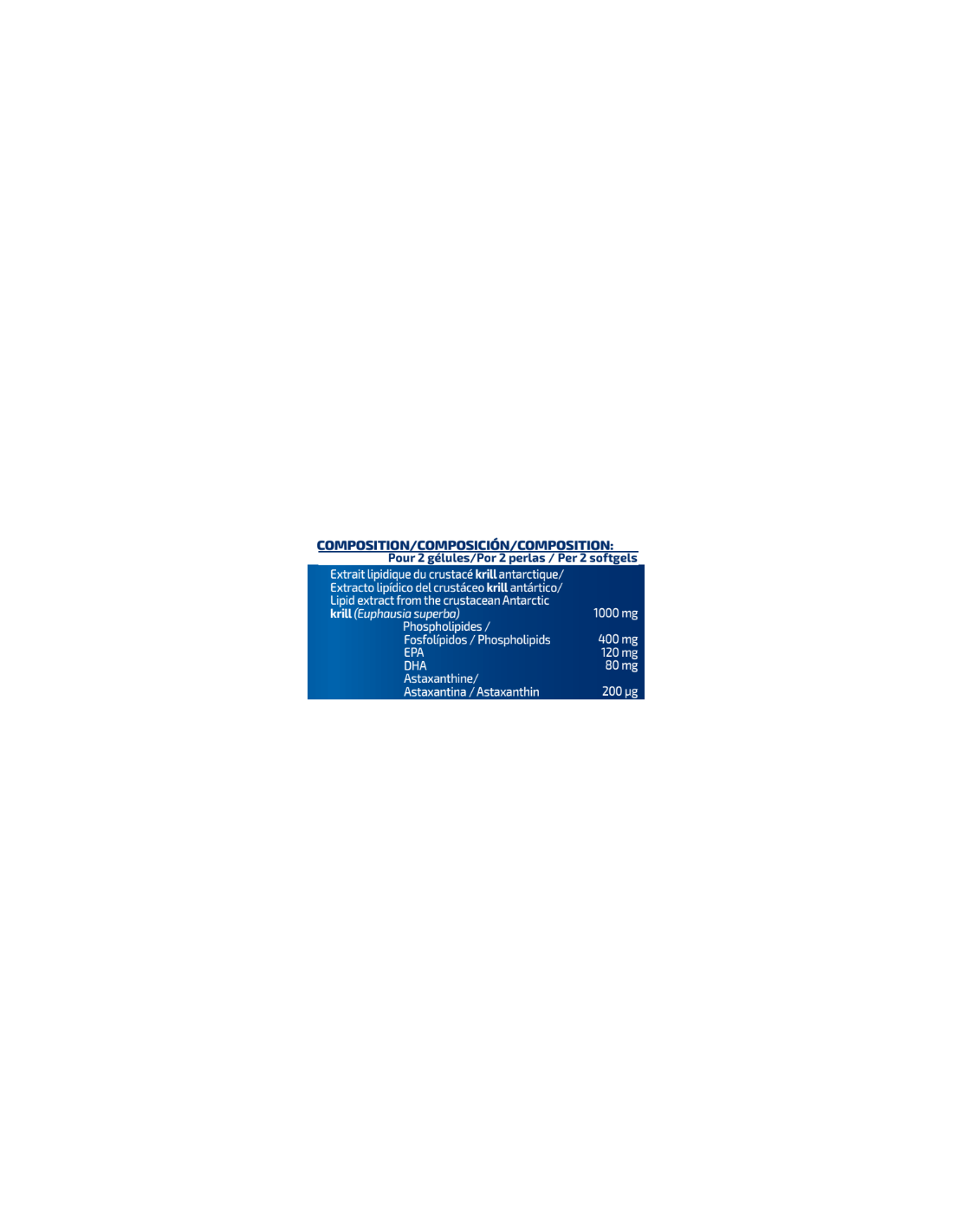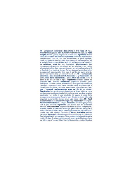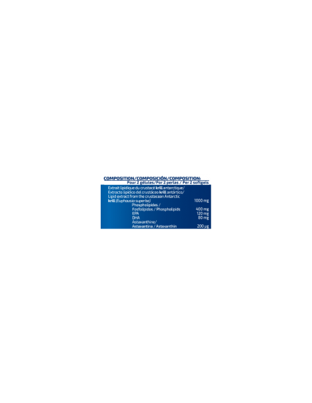 Cada dosis contiene un 40% de fosfolípidos, 12% de EPA y 8% de DHA y astaxantina, presentes en el krill antártico.