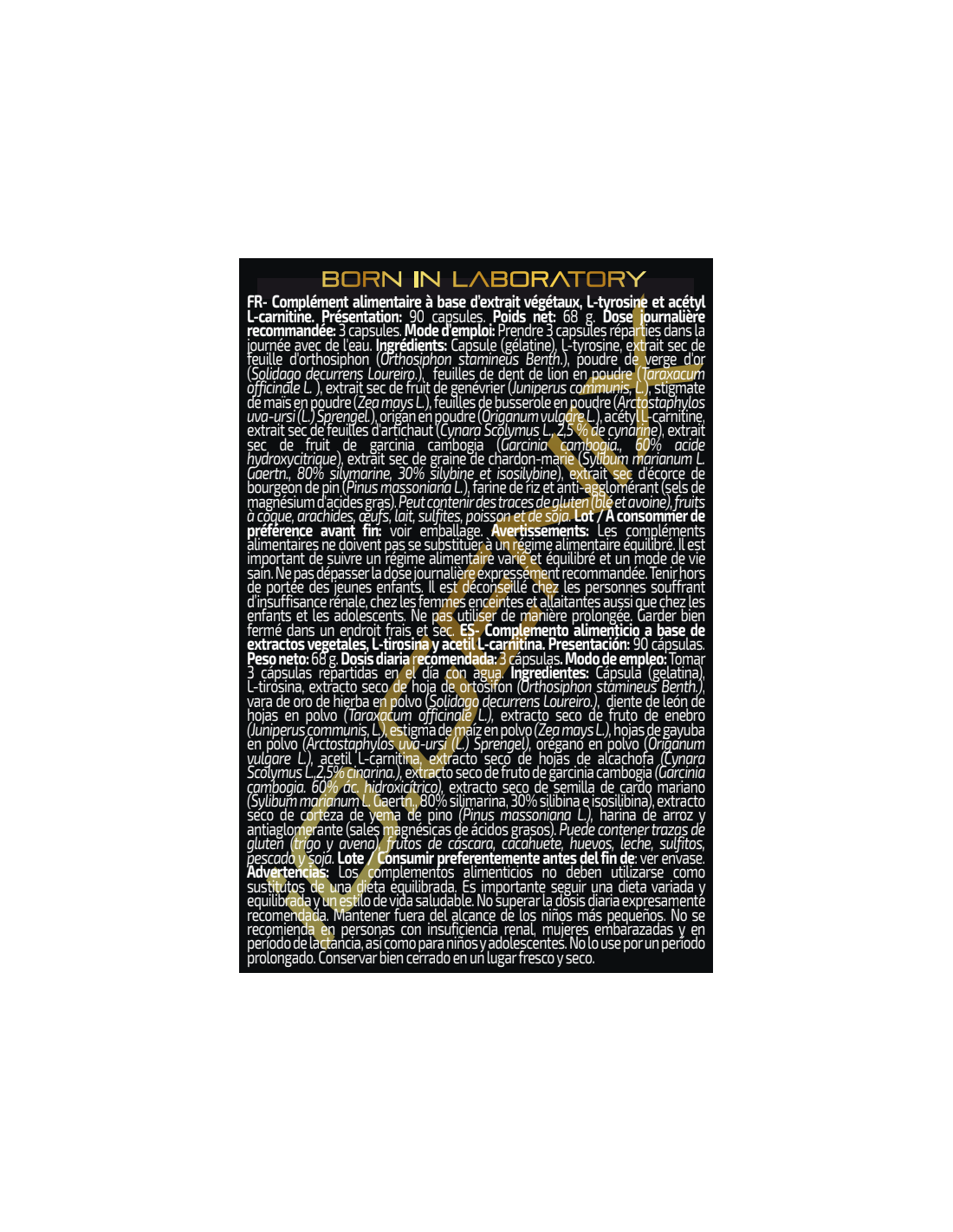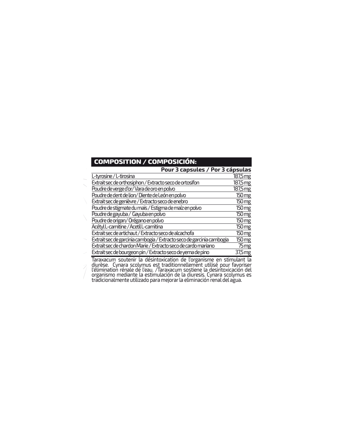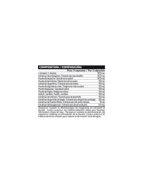 Ingredientes: Agentes de recubrimiento (sulfitos) (gelatina y colorantes (carbonato cálcico y octenil succinato sódico de almidón)), L-tirosina, extracto seco de ortosifon (Orthosiphon stamineus Benth), extracto seco de vara de oro (Solidago virgaurea L.), extracto seco de diente de león (Taraxacum officinale Web.), extracto seco de enebro (Juniperus communis, L), extracto seco de estigma de maiz (Zea mays L.), extracto seco de gayuba (Arctostaphylos uva-ursi (L.)), extracto seco de orégano (Origanum vulgare L.), acetil L-carnitina, extracto seco de alcachofa (Cynara scolymus L.), extracto seco de garcinia cambogia (Garcinia cambogia), extracto seco de cardo mariano (Silybum marianum Gaertn.), extracto seco de pino (Pinus massoniana L.), harina de arroz y antiaglomerante (estearato de magnesio). Puede contener trazas de gluten, huevos, leche, pescado y soja.