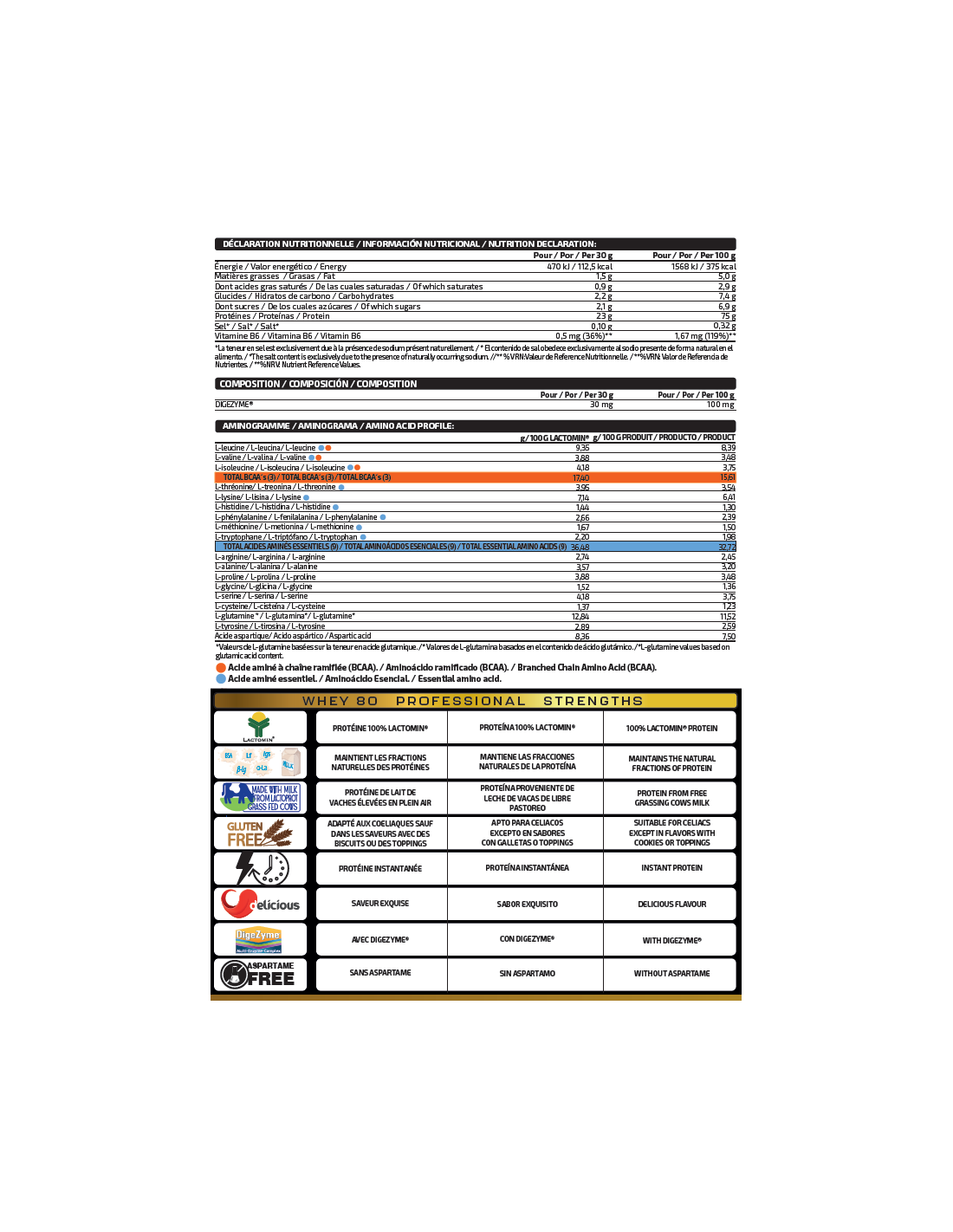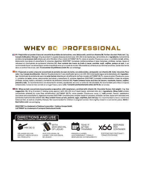 El concentrado de proteína de suero Lactomin® utilizado es un referente de la industria, y no podemos pedir menos para un producto como Whey 80 prosessional. Además, se han añadido BCAA's 8.1.1 de origen vegetal para responder a los deportistas más exigentes y el complejo de enzimas digestivas Digezyme®, con el fin de facilitar aún más si cabe su digestión.