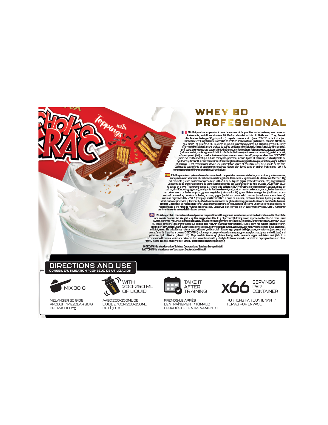 El concentrado de proteína de suero Lactomin® utilizado es un referente de la industria, y no podemos pedir menos para un producto como Whey 80 prosessional. Además, se han añadido BCAA's 8.1.1 de origen vegetal para responder a los deportistas más exigentes y el complejo de enzimas digestivas Digezyme®, con el fin de facilitar aún más si cabe su digestión.