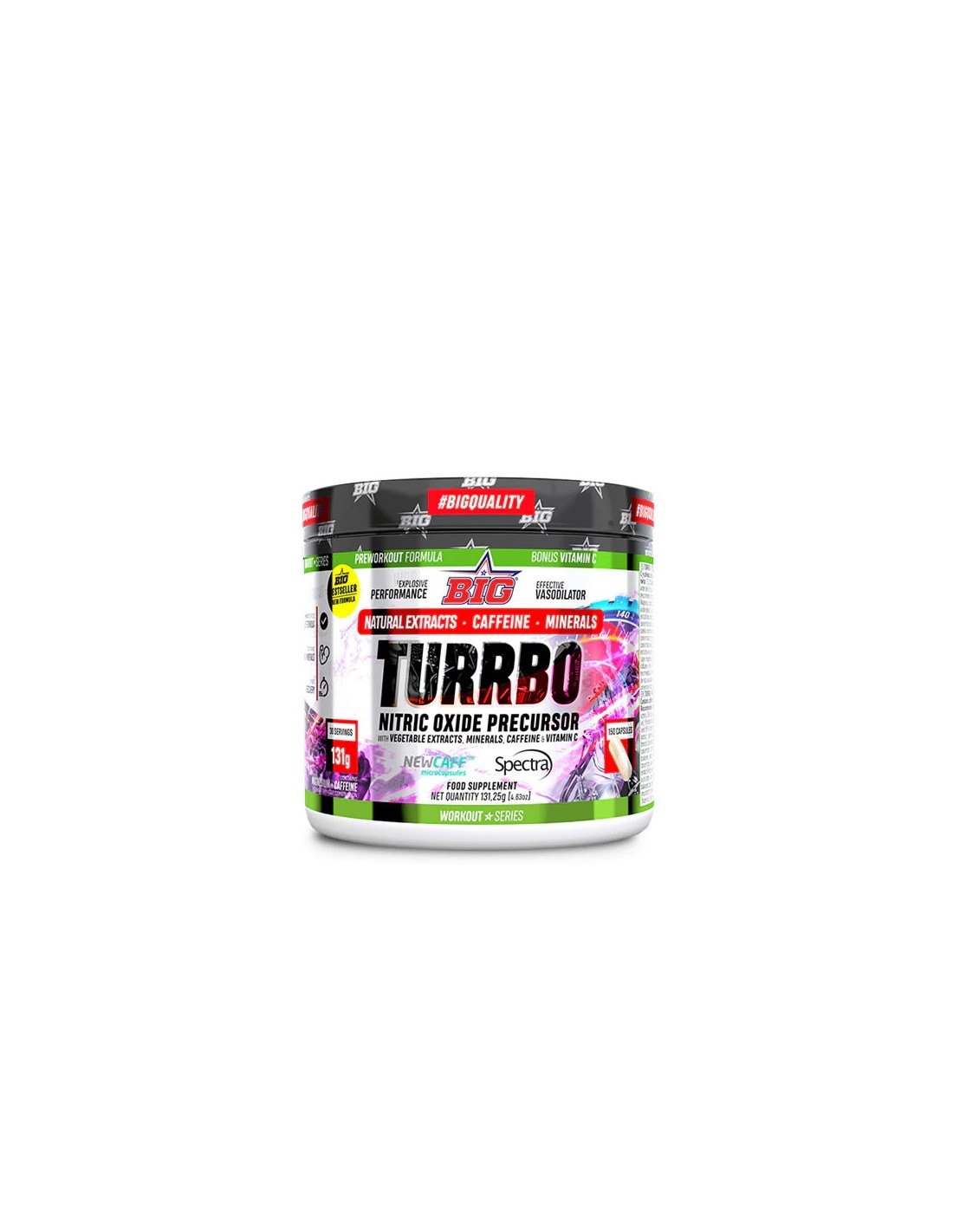 El nuevo TURRBO de BIG® es un complejo pre-entreno con extractos vegetales, minerales, cafeína y vitamina C reformulado para aumentar y prolongar la acción vasodilatadora del óxido nítrico, así como para aportar nutrientes a la musculatura y prevenir la acción de radicales libres durante tus sesiones de entrenamiento mas intensas.