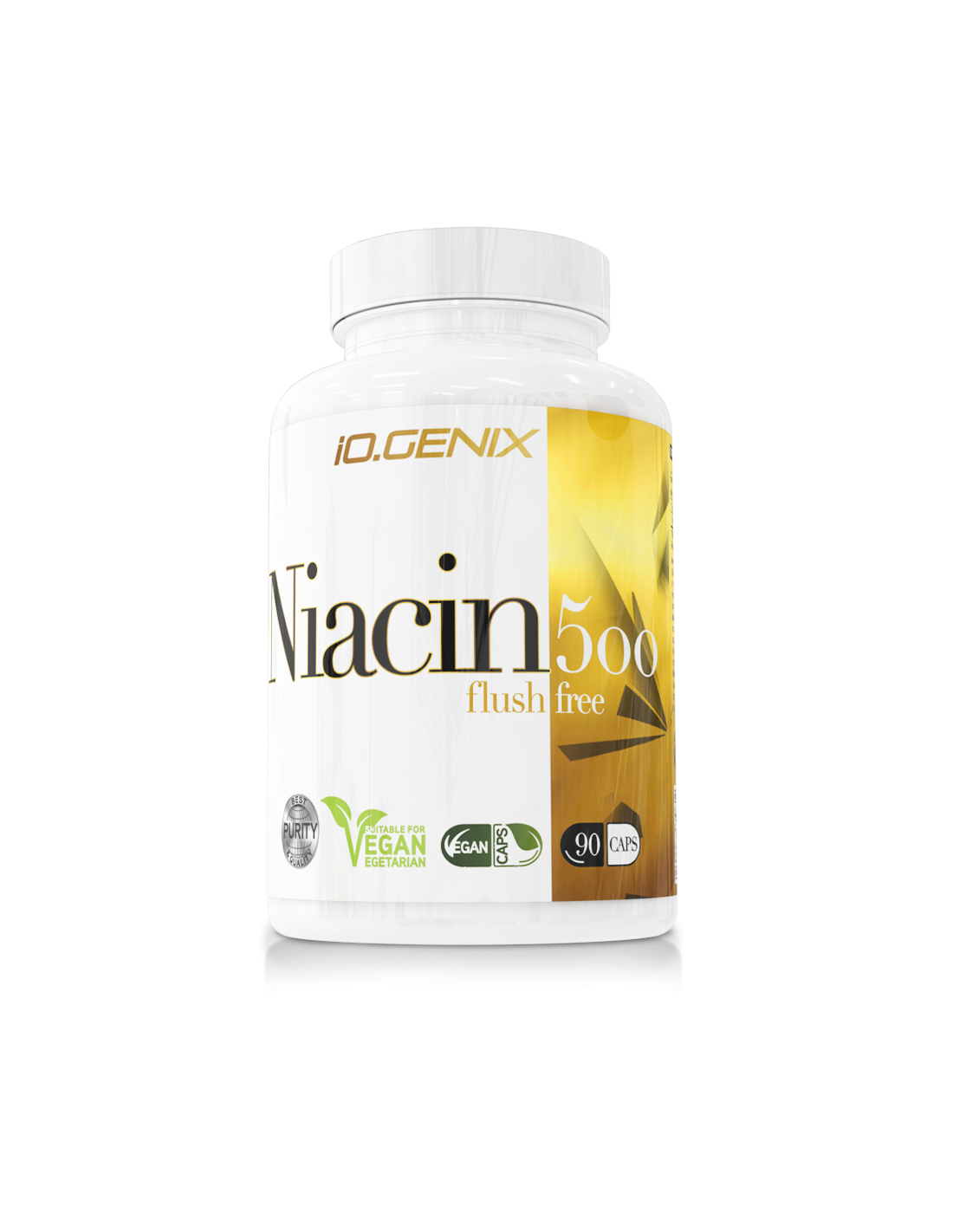 El hexanicotinato de inositol utilizado en iO.GENIX, no solo evita el efecto del rubor en la piel, sino que también garantizada más de un 78% de niacina. Es decir, cada cápsula de este producto proporciona 500 mg de niacina (3125% VRN)*. Una cantidad segura y eficaz de esta vitamina.