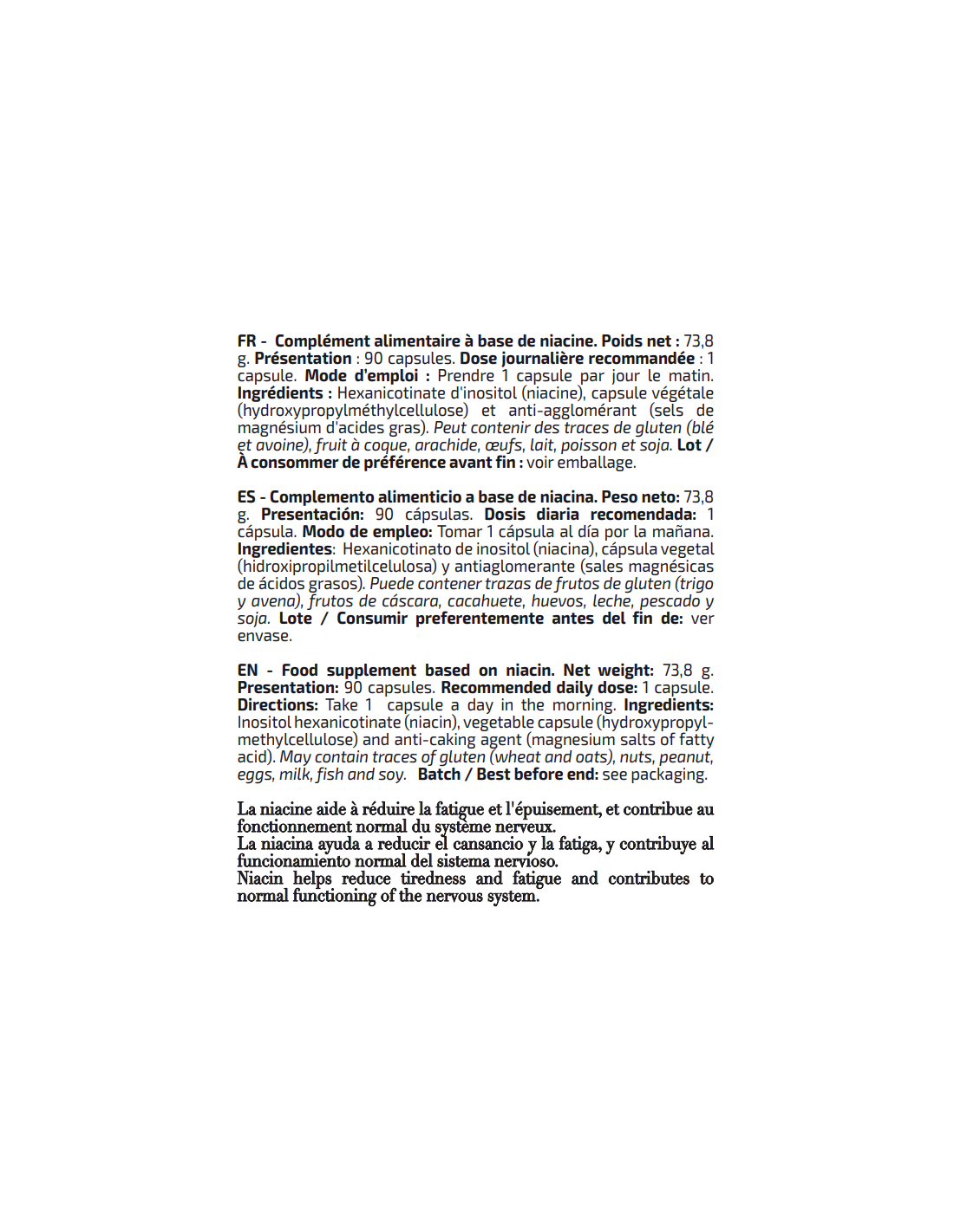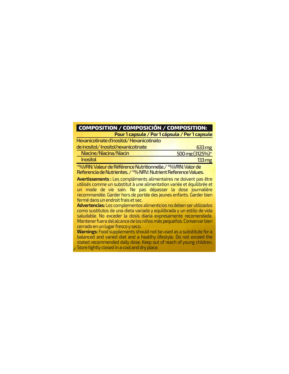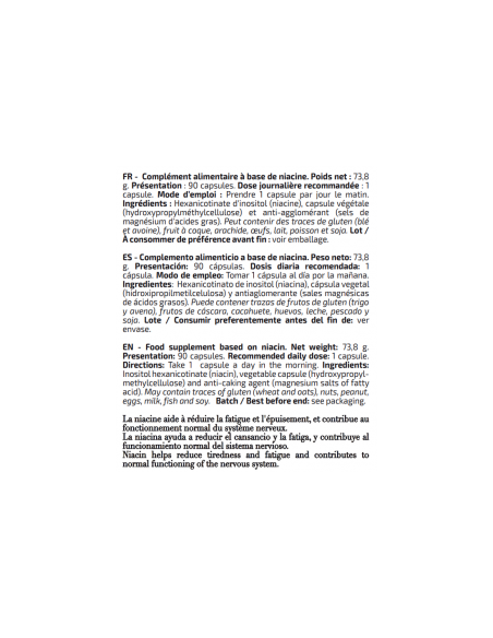 En la formulación de este complemento alimenticio se ha utilizado una materia prima de Hexanicotinato de inositol de total garantías que proporciona un buen rendimiento de esta vitamina.