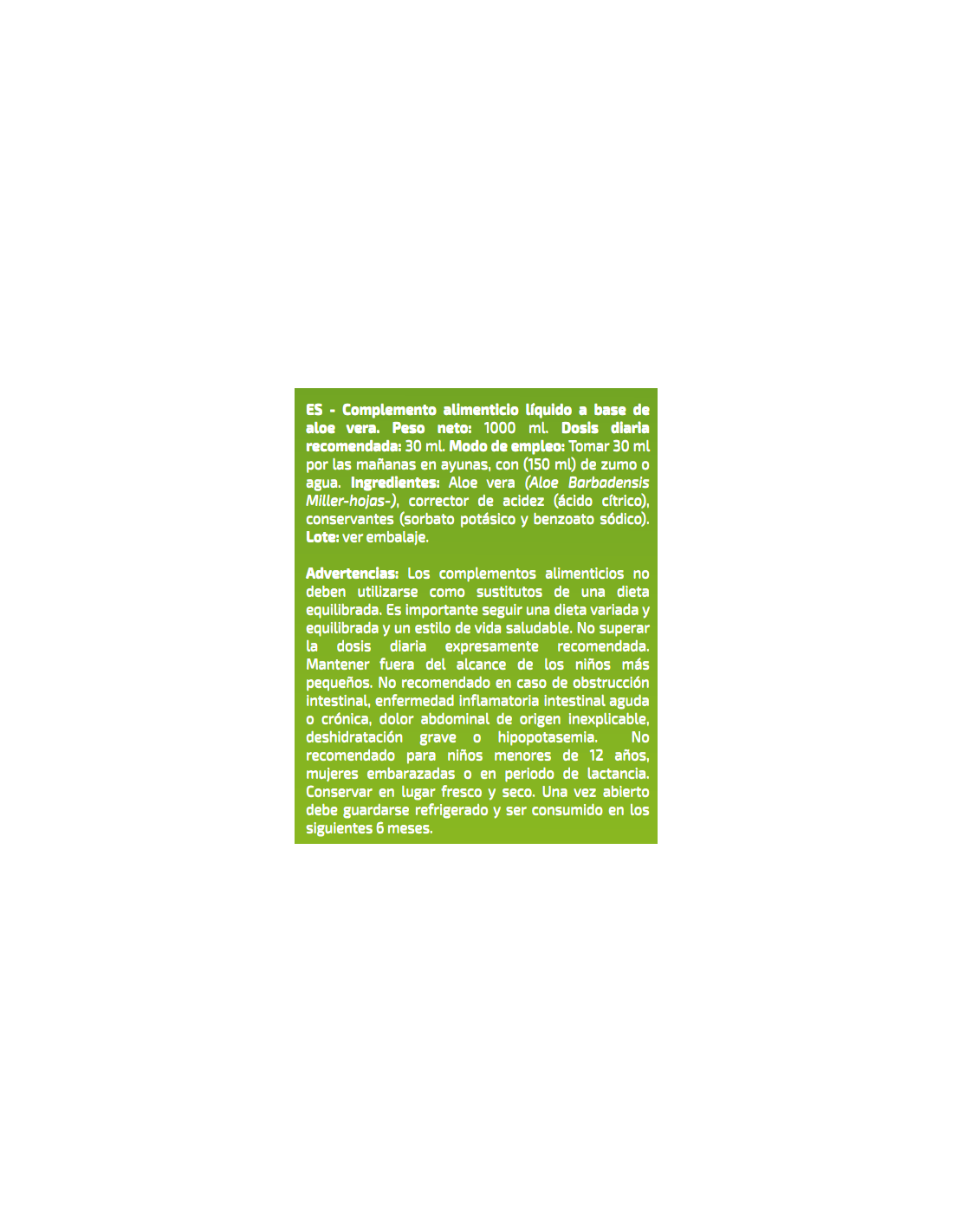 Aloe Vera 100% sin aditivos ni conservantes en su forma más pura para tomar directamente por las mañanas junto a zumo o agua.