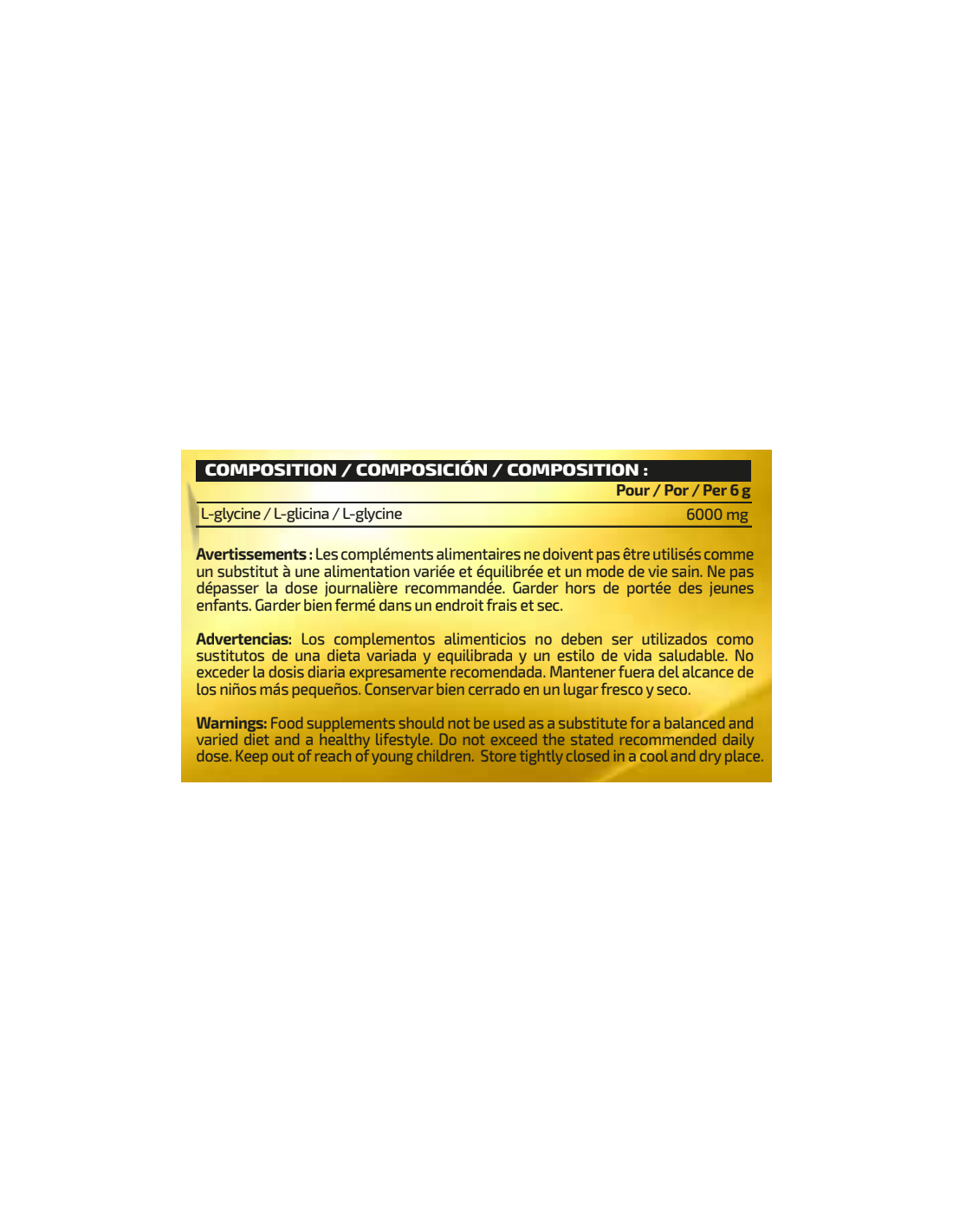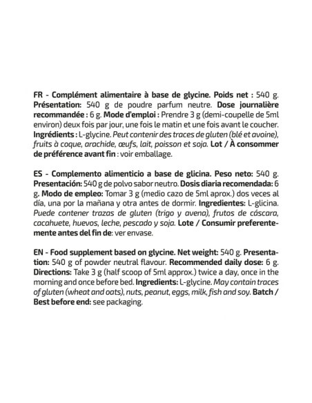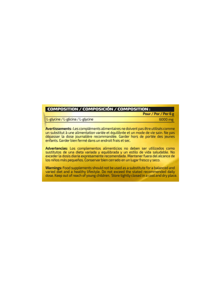L-glicina 100%, formato, polvo y sabor neutro, perfecto para añadir como producto único o junto a otros complementos alimenticios
