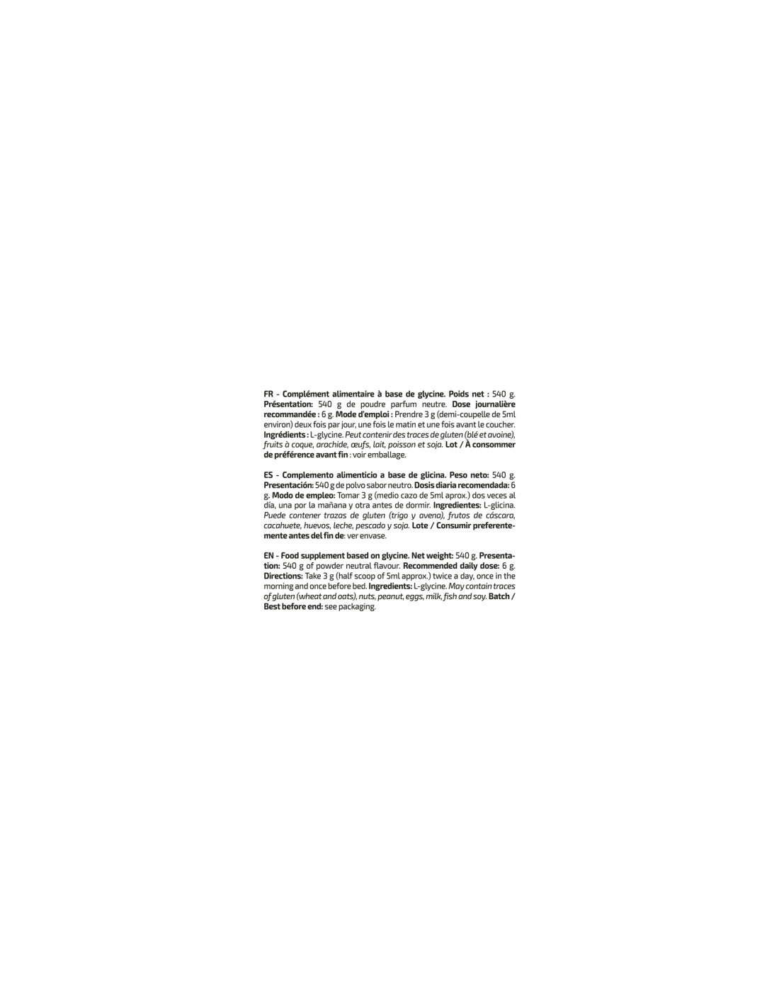 Se trata de una materia prima que no contiene nada más que glicina en polvo elaborada por fermentación vegetal, por lo que es apta 100% para personas que llevan una alimentación vegetariana y vegana.