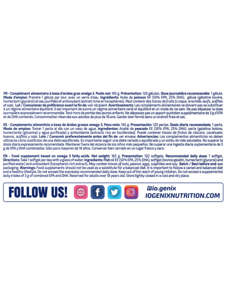 Ingredientes: Aceite de pescado EE (50% EPA, 25% DHA), cobertura de la perla (gelatina bobina, glicerina y agua) y antioxidantes E (mezcla de tocoferoles). Puede contener trazas de gluten, huevos, leche y soja.