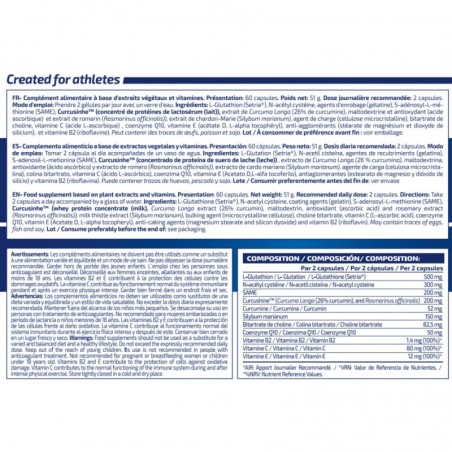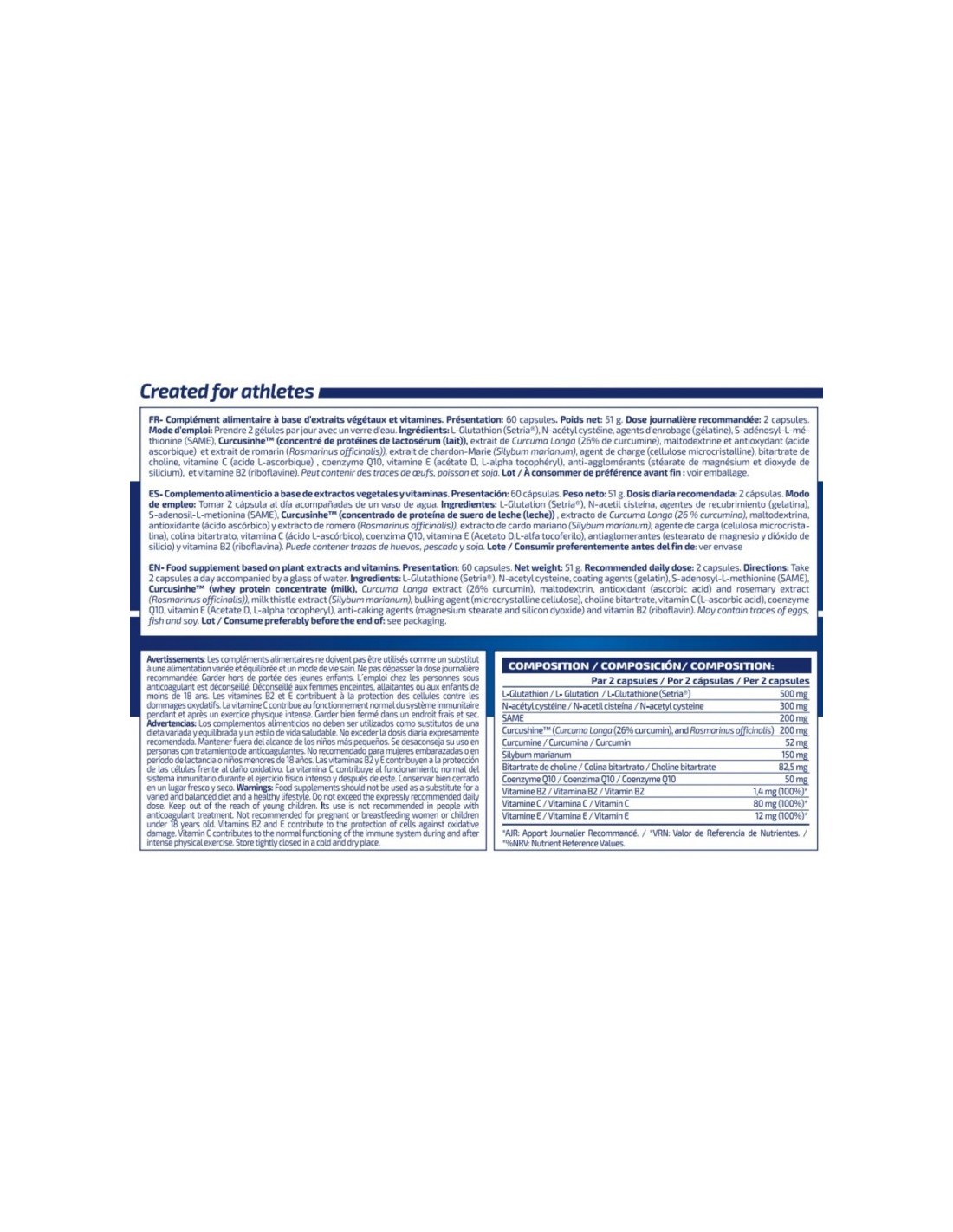 Complemento alimenticio a base de extractos vegetales y vitaminas. Presentación: 60 cápsulas. Peso neto: 51 g. Dosis diaria recomendada: 2 cápsulas. Modo de empleo: Tomar 2 cápsulas al día acompañadas de un vaso de agua. Ingredientes:L-Glutation (Setria®), N-acetil cisteína, agentes de recubrimiento (gelatina), S-adenosil-L-metionina (SAME), Curcusinhe® (concentrado de proteína de suero de leche (leche)) , extracto de Curcuma Longa (26 % curcumina), maltodextrina, antioxidante (ácido ascórbico) y extracto de romero (Rosmarinus officinalis)), extracto de cardo mariano (Silybum marianum), agente de carga (celulosa microcristalina), colina bitartrato, vitamina C (ácido L-ascórbico), coenzima Q10, vitamina E (Acetato D,L-alfa tocoferilo), antiaglomerantes (estearato de magnesio y dióxido de silicio) y vitamina B2 (riboflavina). Puede contener trazas de huevos, pescado y soja.