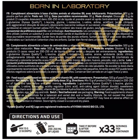 Ingredientes: L-glutamina (Kyowa Quality®), L-leucina, dextrosa, aroma (leche), acidulante (ácido cítrico), L-isoleucina, L-valina, antiaglomerante (dióxido de silicio), canela en polvo, colorante (caramelo de sulfito amónico), edulcorantes (sacarina sódica y sucralosa) y vitamina B6 (clorhidrato de piridoxina). Puede contener trazas de gluten, huevos, pescado y soja.